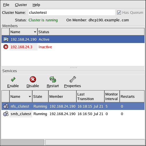 The Cluster Status Tool displays the status of the cluster service, cluster members, and application services, and shows statistics concerning service operation.