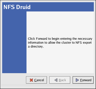 3. Start the NFS Druid by choosing Add Exports => NFS... and click Forward to continue.