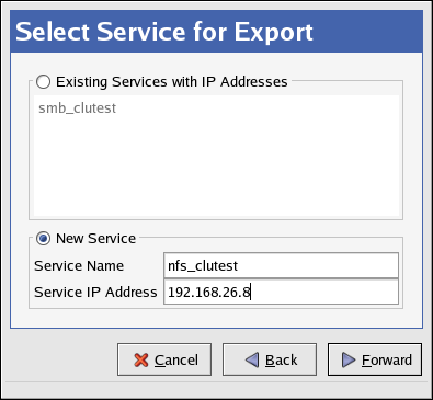 5. If an existing service contains the device and mountpoint configuration for the directory you want to NFS export, then select that existing service. Otherwise, enter a new Service Name and Service IP Address for the NFS export directory.