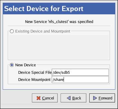 If you selected an existing service, then devices for that service will be listed under Existing Device and Mountpoint. If the device and mount point for your NFS export is listed, then select it.