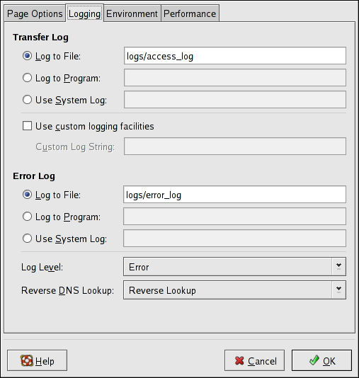 The transfer log contains a list of all attempts to access the Web server. It records the IP address of the client that is attempting to connect, the date and time of the attempt, and the file on the Web server that it is trying to retrieve. Enter the name of the path and file in which to store this information. If the path and file name do not start with a slash (/), the path is relative to the server root directory as configured. This option corresponds to the TransferLog directive.